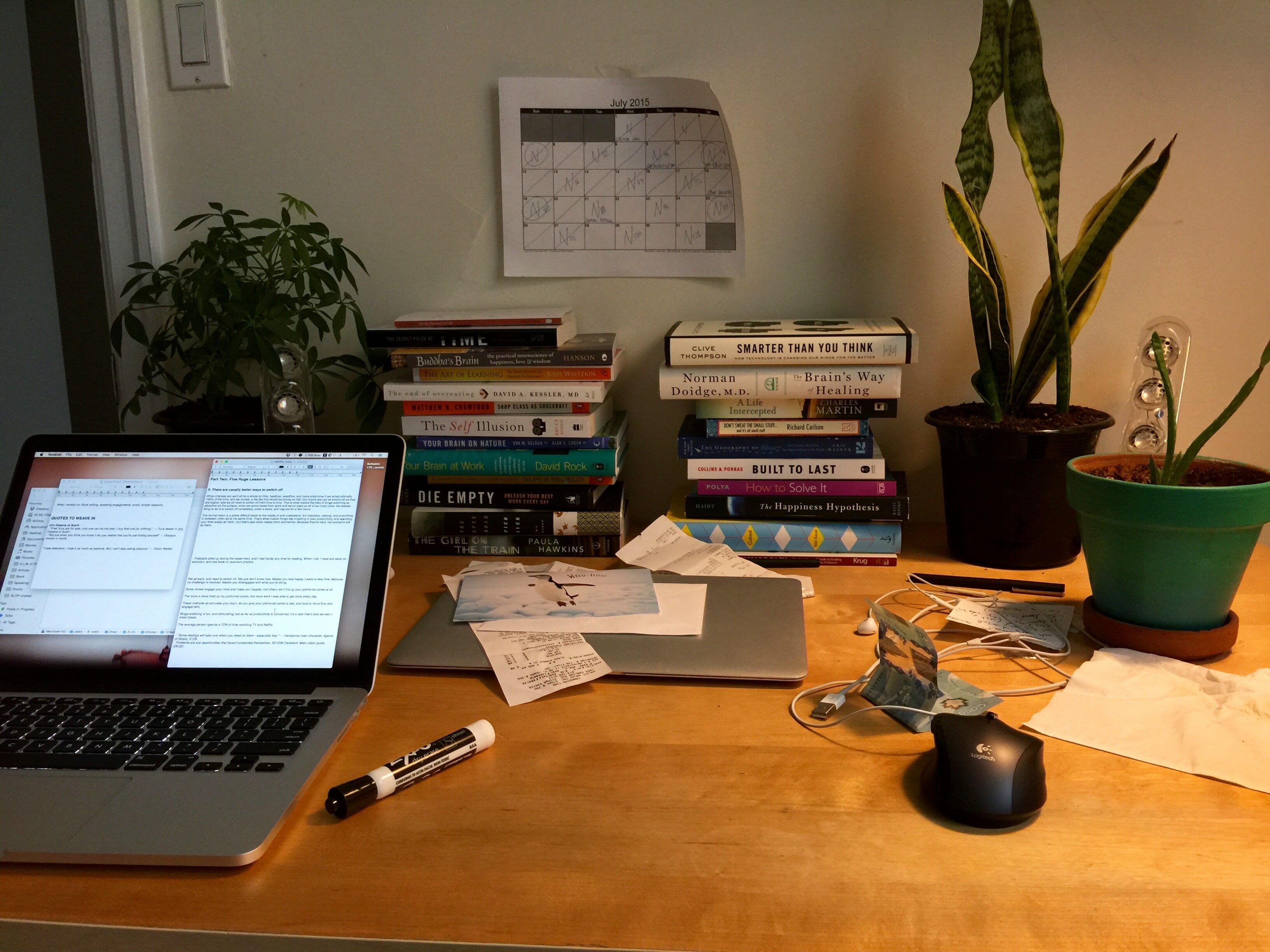 As the month went on, the number of podcasts and Audiobooks on my phone increased, and the books in the to-read pile on my desk (to the right) stacked up higher. I was accustomed to plowing through them at a pretty good clip. (Prior to this experiment, I watched only an hour or two of Netflix in a typical week—not counting when new seasons of House of Cards come out, of course.) I also had less time and motivation for the things I usually love doing, like exercising, meditating, going for walks, and going for the occasional massage. I even noticed that my mood became shot by the end of the experiment—an effect noted in a study conducted at the University of Texas at Austin, which found feelings of loneliness and depression to be linked to binge-watching.5