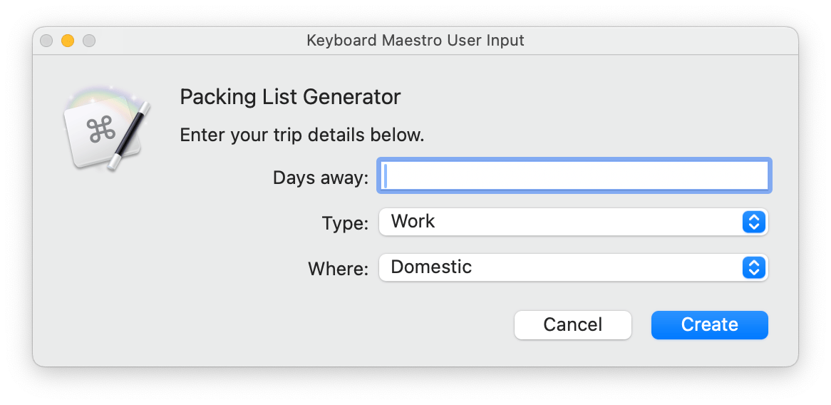 The list is precise, right down to how many pairs of socks and underwear I’ll need based on the time I’ll be away. I rarely need everything on the list—but I just delete the items I don’t and pack the rest. (If you’re looking to get started with Keyboard Maestro, I highly recommend David Sparks’ terrific field guide.)